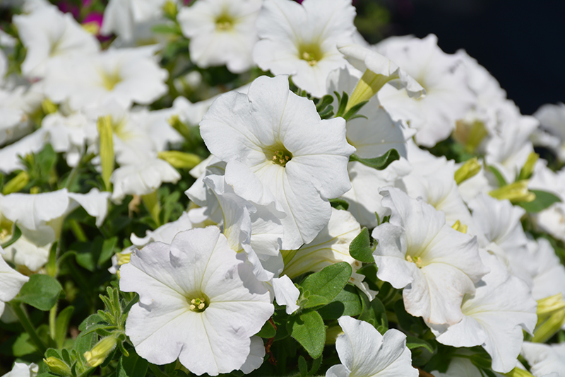 Easy Wave® White Petunia is draped in stunning white trumpet-shaped flowers at the ends of the stems from mid spring to late summer. Its pointy leaves remain green in color throughout the season.
