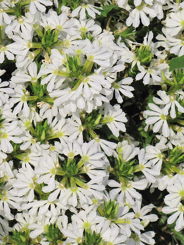 Bombay® White Fan Flower will grow to be about 8 inches tall at maturity, with a spread of 16 inches. When grown in masses or used as a bedding plant, individual plants should be spaced approximately 12 inches apart. Its foliage tends to remain low and dense right to the ground. Although it's not a true annual, this fast-growing plant can be expected to behave as an annual in our climate if left outdoors over the winter, usually needing replacement the following year. As such, gardeners should take into consideration that it will perform differently than it would in its native habitat.