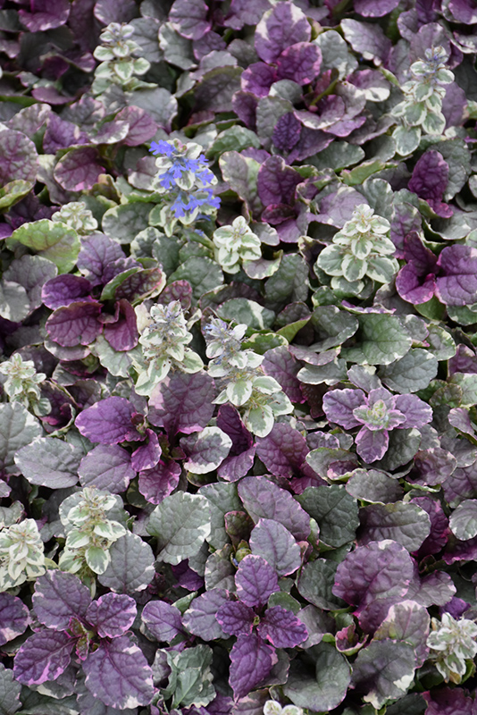 Burgundy Glow Bugleweed's attractive small crinkled round leaves emerge burgundy in spring, turning dark green in color with showy creamy white variegation and tinges of purple the rest of the year on a plant with a spreading habit of growth. It features subtle spikes of sky blue flowers rising above the foliage from mid spring to early summer.