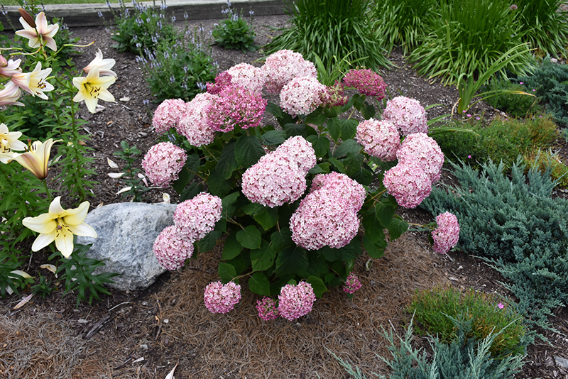 Incrediball® Blush Smooth Hydrangea features bold balls of pink flowers with silver overtones at the ends of the branches from mid to late summer. The flowers are excellent for cutting. It has dark green deciduous foliage. The heart-shaped leaves do not develop any appreciable fall color.