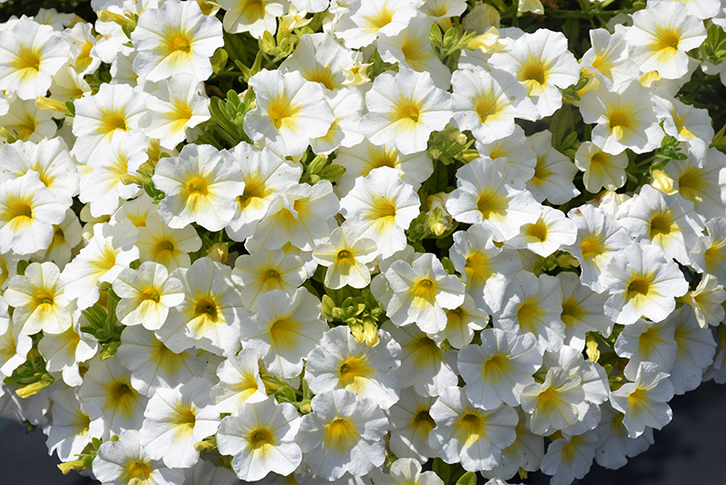 Superbells® Over Easy™ Calibrachoa is blanketed in stunning white trumpet-shaped flowers with yellow throats at the ends of the stems from late spring to early fall, which emerge from distinctive buttery yellow flower buds. Its small pointy leaves remain green in color throughout the season.