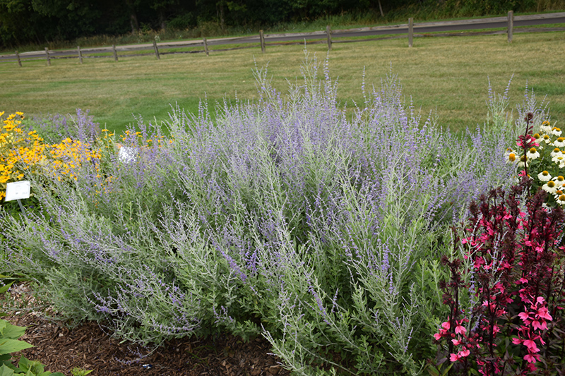 Blue Steel Russian Sage will grow to be about 24 inches tall at maturity, with a spread of 28 inches. When grown in masses or used as a bedding plant, individual plants should be spaced approximately 24 inches apart. It grows at a fast rate, and under ideal conditions can be expected to live for approximately 10 years. As an herbaceous perennial, this plant will usually die back to the crown each winter, and will regrow from the base each spring. Be careful not to disturb the crown in late winter when it may not be readily seen!