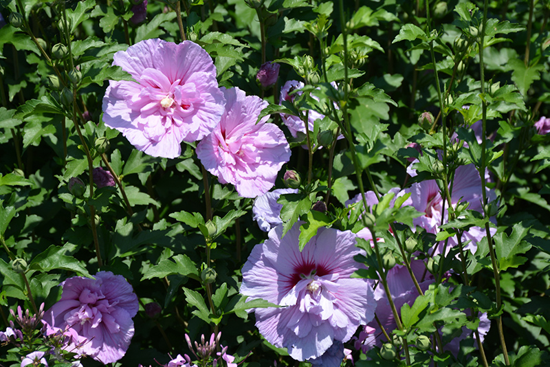 Lavender Chiffon® Rose Of Sharon features bold semi-double lavender round flowers with rose eyes along the branches from mid summer to early fall. It has green deciduous foliage. The lobed leaves do not develop any appreciable fall color.