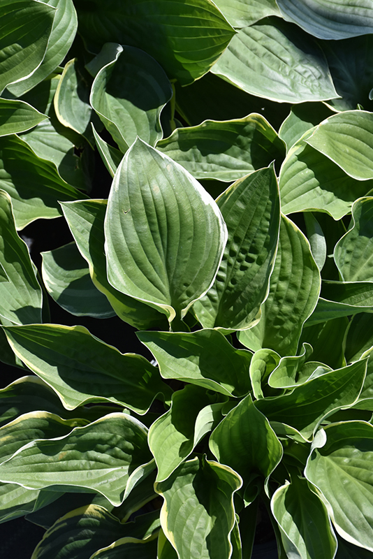 Unique variety with large rounded and cupped leaves that are dark green with a creamy white edge; nice substance and is heavily crinkled; white spikes of flowers in summer with vestigial leaves in the shape of a christmas tree